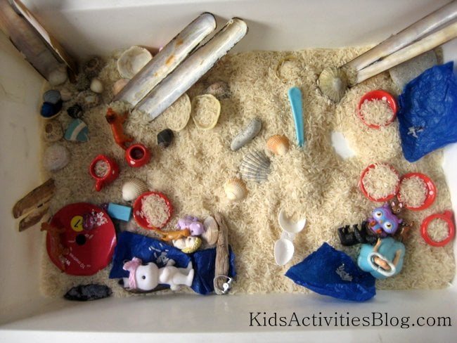 We’d been to a white pebble beach on our vacation, so we filled our tub with white rice to recreate it. You could also use sand or try this idea for a rock pool that I love from Nurture Store.
